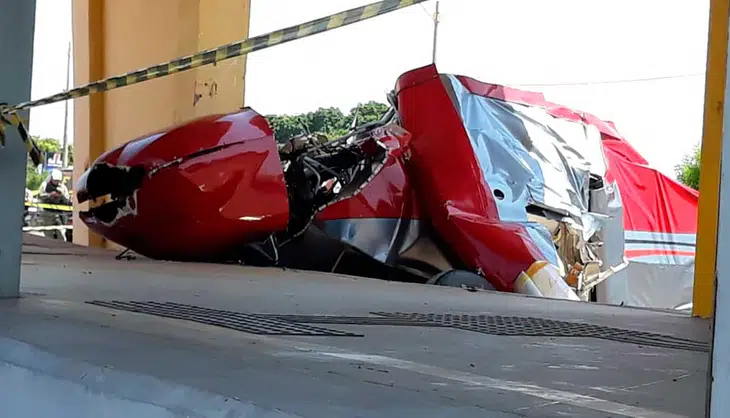 Imagens mostram os destroços do avião após o acidente. A parte dianteira da aeronave ficou dentro de uma estação de ônibus localizada na BR.