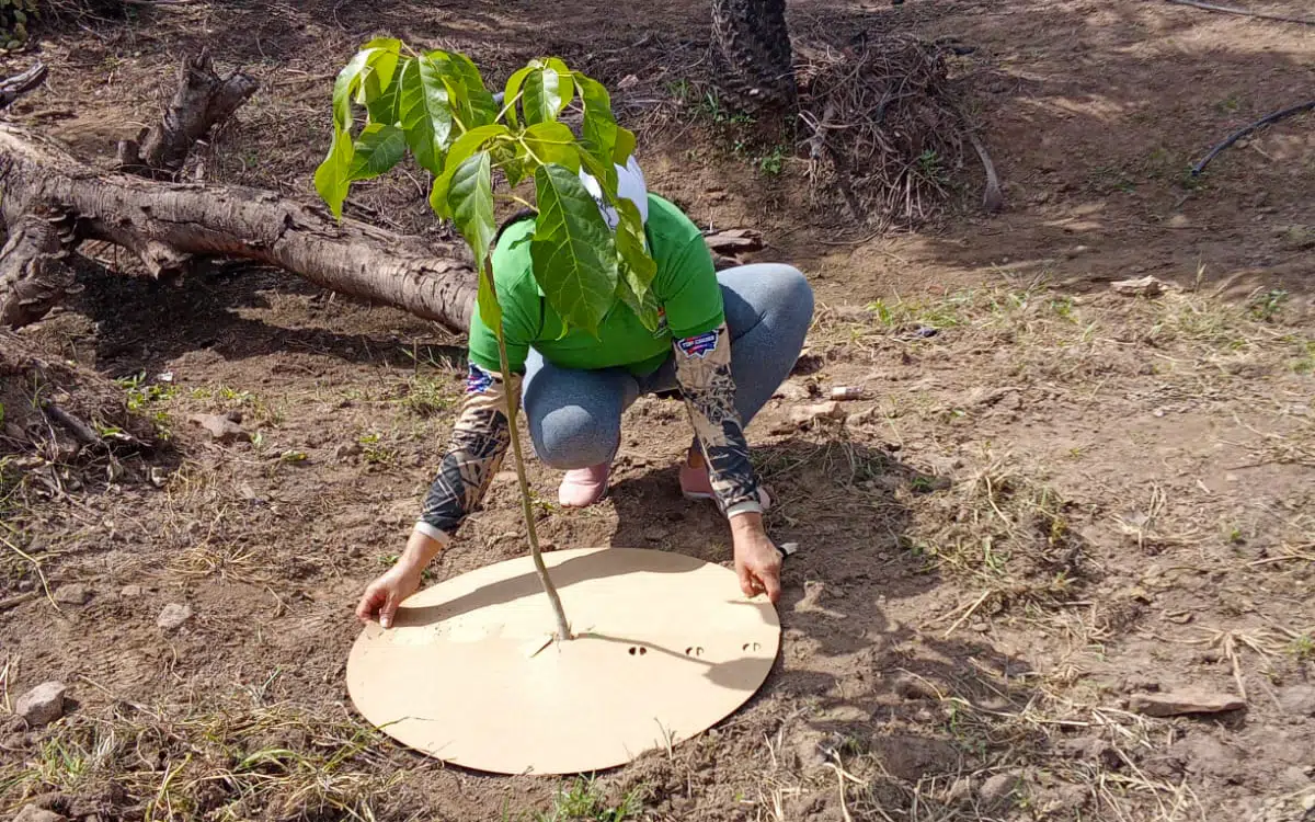 Além disso, os discos também impedem o crescimento de plantas invasoras próximas à base das mudas, evitando que essas espécies concorram por água e nutrientes, o que fortalece o desenvolvimento das plantas nativas.