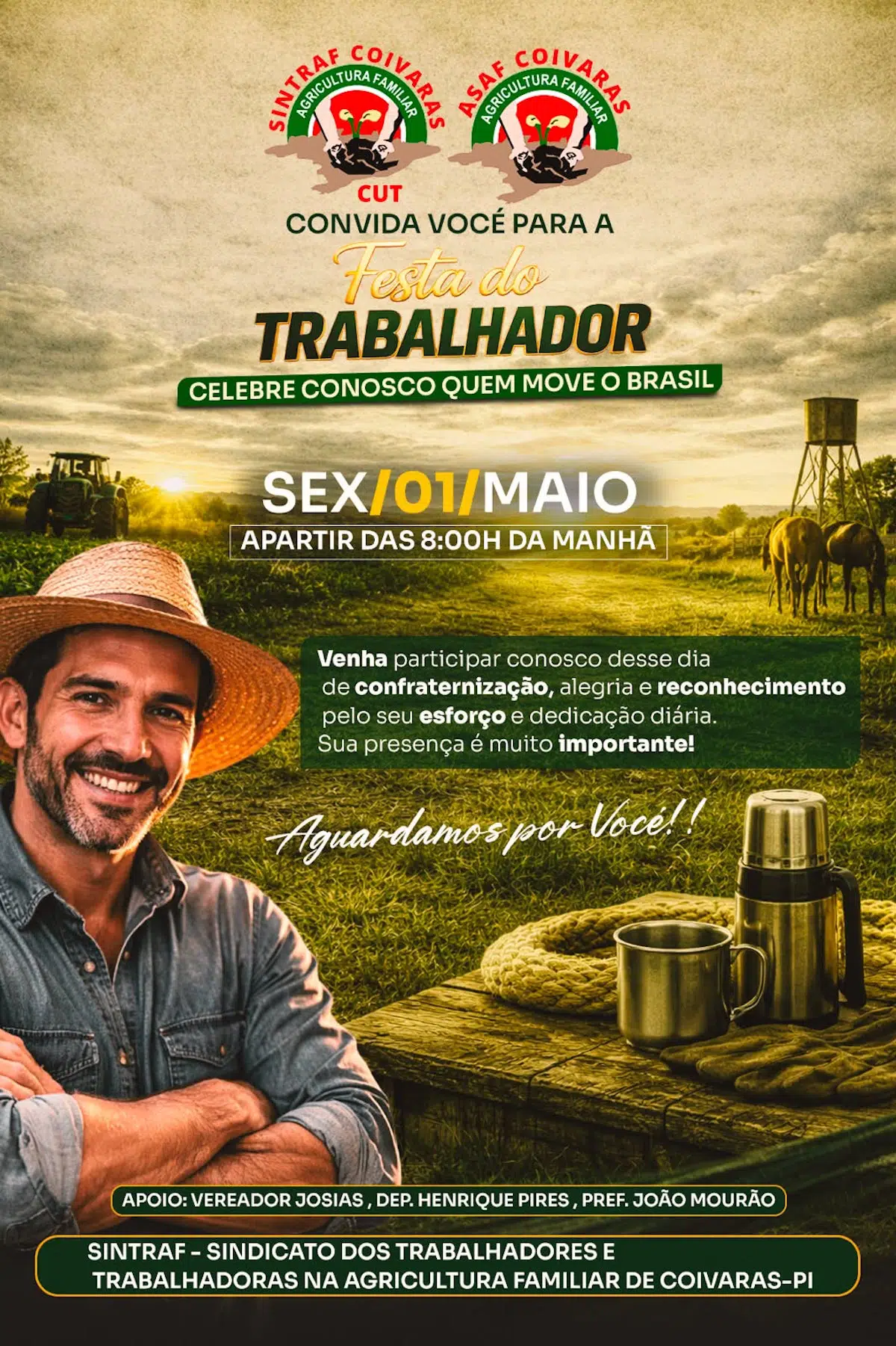 Evento acontece no dia 1º de maio e celebra a força da agricultura familiar no municípioO Sindicato dos Trabalhadores e Trabalhadoras na Agricultura Familiar de Coivaras (SINTRAF), em parceria com a ASAF, promove no próximo dia 1º de maio, a tradicional Festa do Trabalhador no município de Coivaras, no Piauí.