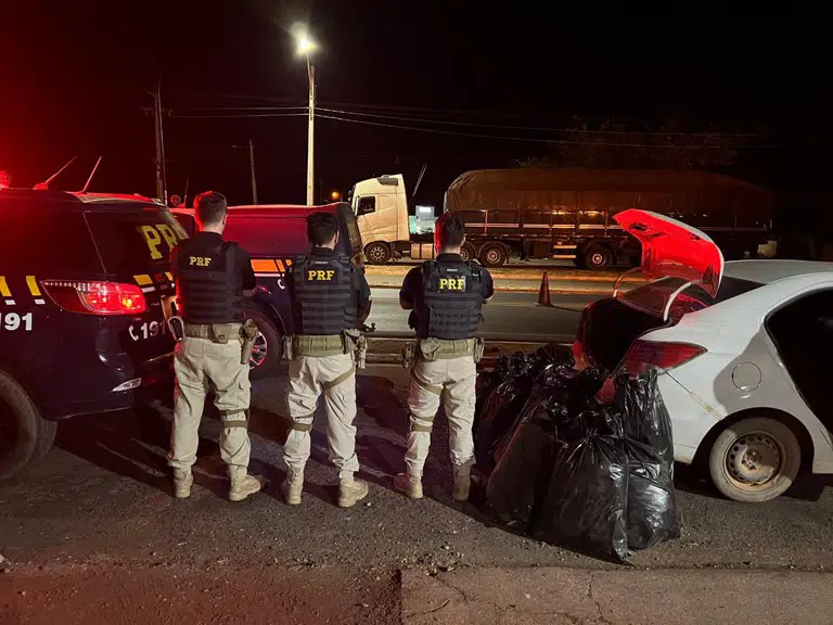 Ao iniciar a fiscalização, os agentes perceberam um forte odor característico de maconha vindo do interior do veículo. Diante da suspeita, foi realizada uma busca minuciosa nos compartimentos do carro. Um total de 13 sacos de cor preta contendo a substância ilícita, foram localizados. A droga estava distribuída entre o porta-malas e o banco traseiro do carro.