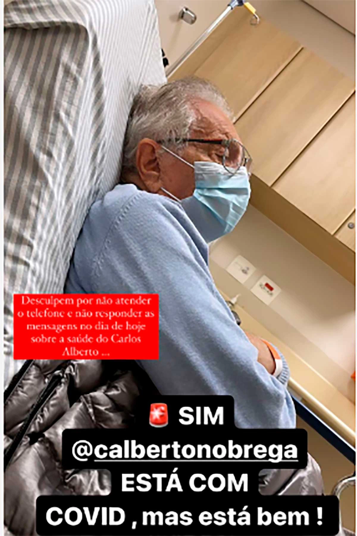 No post ela disse que Carlos Alberto testou positivo para covid-19, mas "está bem". Ela também publicou uma foto do marido deitado em uma cama do hospital com uma máscara de proteção.