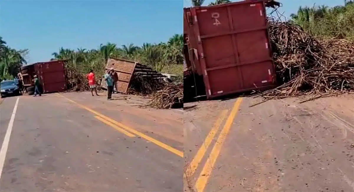 Carreta carregada com cana-de-açúcar tomba e causa transtornos na PI-112