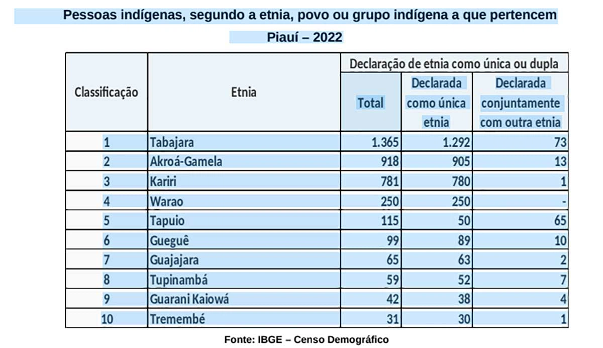 Dados são do Censo Demográfico 2022Um total de 81 etnias, povos ou grupos indígenas foram registrados no Piauí pelo Censo Demográfico 2022, observando-se um aumento de 34 a mais em relação às 47 etnias indígenas relacionadas em 2010. Dentre as etnias indígenas registradas em 2022 no estado, a Tabajara