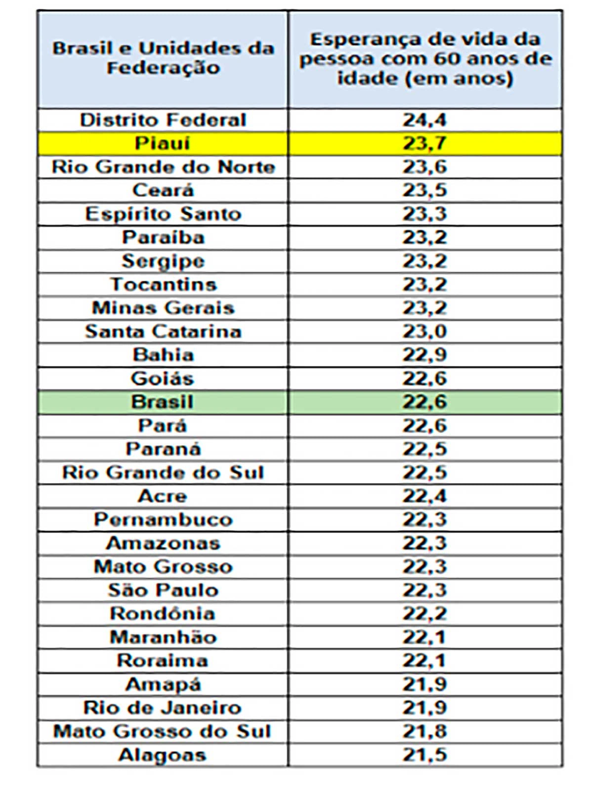 A esperança de vida para a pessoa de 60 anos de idade no Piauí era superior à registrada para o Brasil (22,6 anos). Dentre as unidades da federação, os maiores indicadores ficaram com: Distrito Federal (24,4 anos), Piauí (23,7 anos) e Rio Grande do Norte (23,6 anos). Os menores indicadores ficaram com: Alagoas (21,5 anos), Mato Grosso do Sul (21,8 anos) e Rio de Janeiro (21,9 anos).