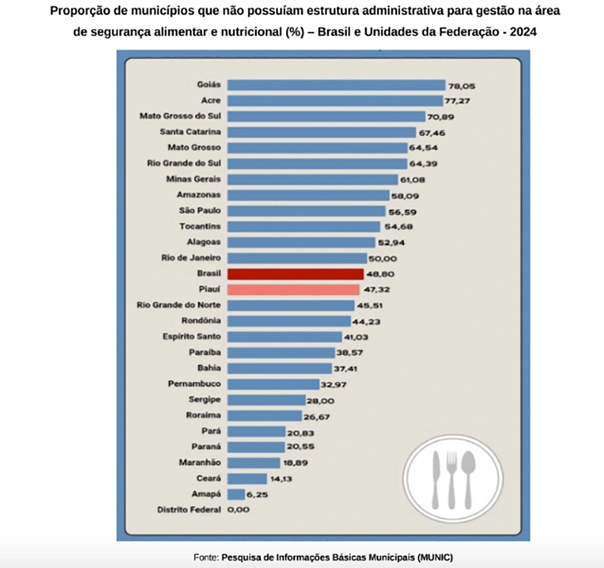 Piauí tem a segunda maior taxa do Nordeste, segundo o IBGEDe acordo com a Pesquisa de Informações Básicas Municipais (MUNIC) 2024 e a Pesquisa de Informações Básicas Estaduais (ESTADIC) 2024, divulgadas peloIBGE em novembro de 2025, o Piauí apresenta um dos maiores índices do país de municípios sem estrutura administrativa voltada à segurança alimentar. O levantamento aponta que 106 municípios piauienses — o equivalente a 47,32% — não possuem um órgão gestor responsável pela execução de políticas públicas de segurança alimentar e nutricional.