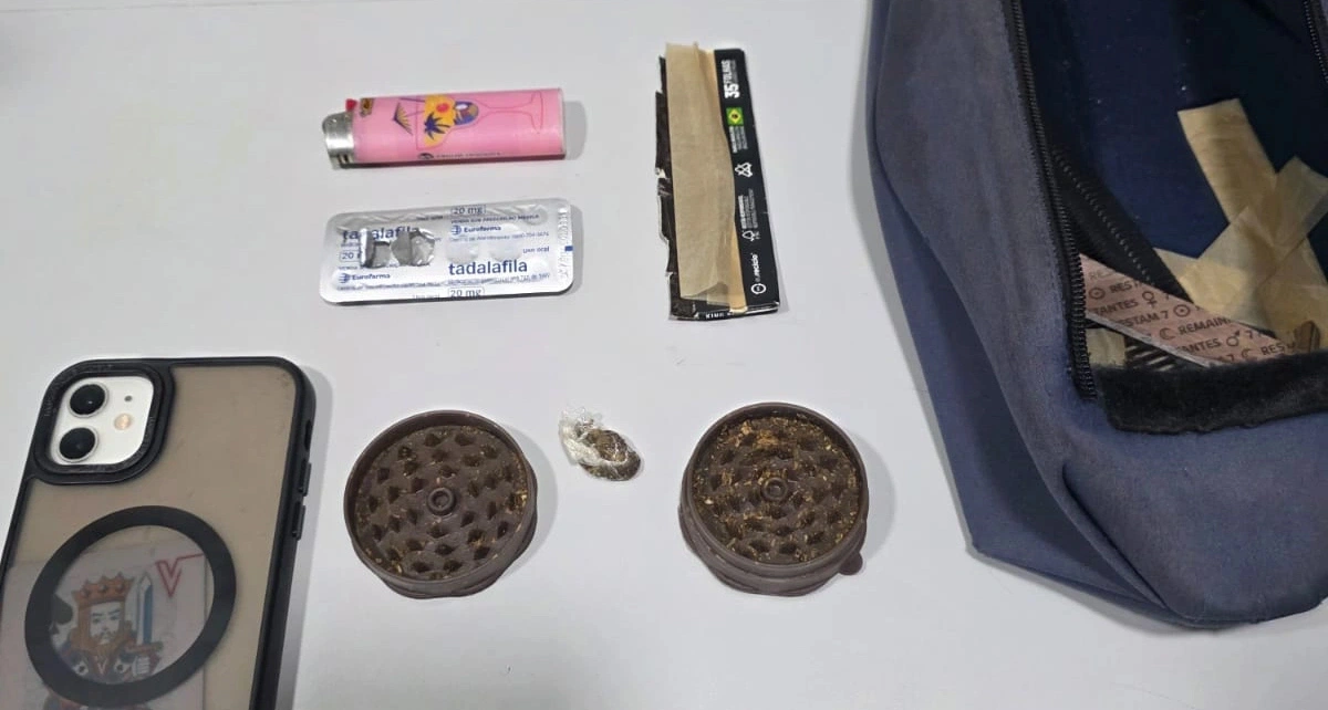 Durante a vistoria no interior do veículo, os peritos encontraram uma garrafa de bebida alcoólica parcialmente consumida, além de um invólucro de maconha, triturador de ervas, seda e um isqueiro.